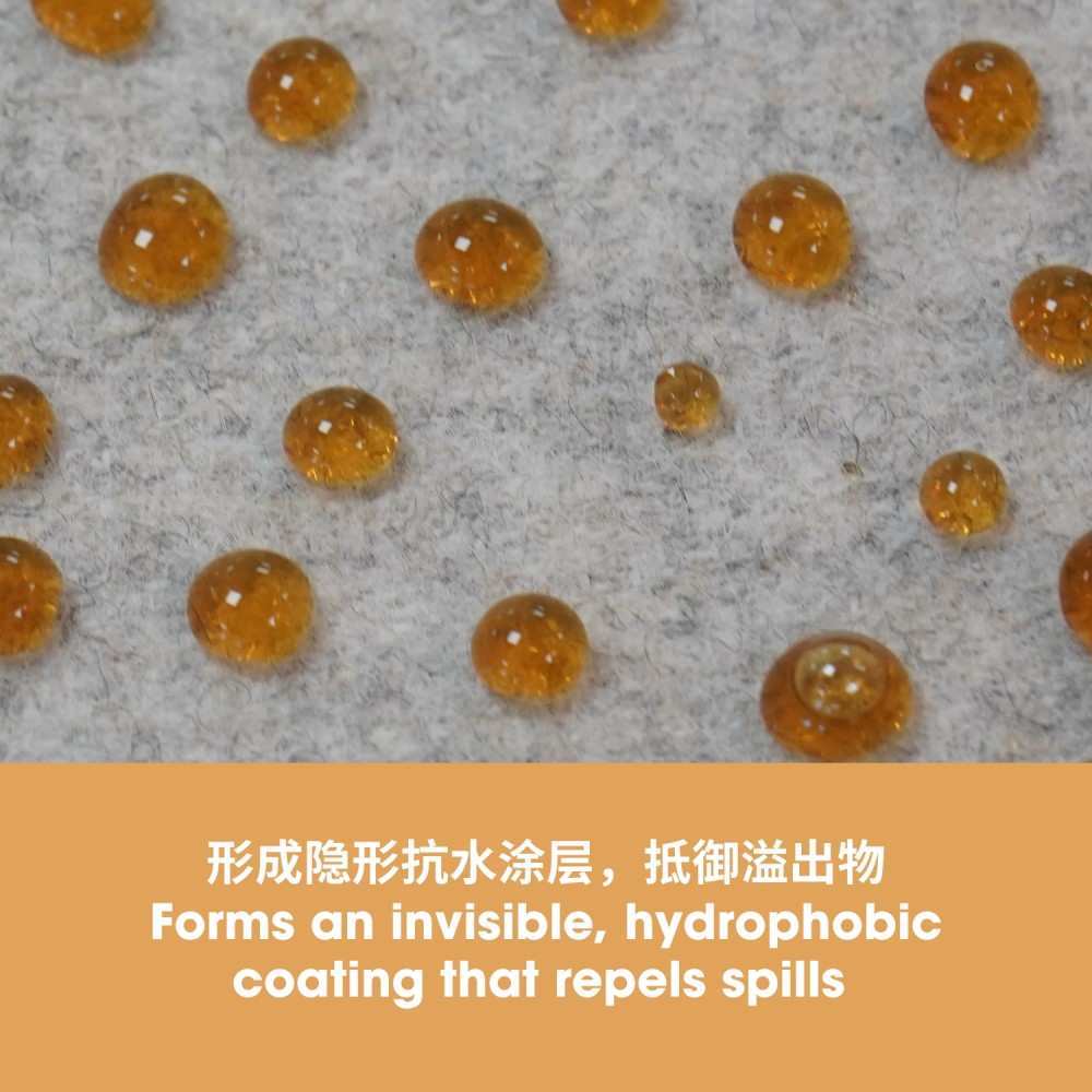 地毯及织物内饰防护剂的工作原理是通过渗透每根单独的纤维,形成一个隐形的疏水涂层。涂层可以抵御地毯、织物内饰及衣物上的各种油性及水性的污渍,但不会改变材质的外观或手感。