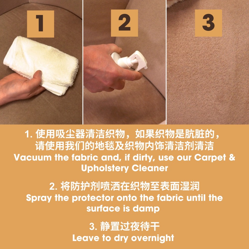 织物内饰:500毫升足够充分保护多至三座位沙发的织物。